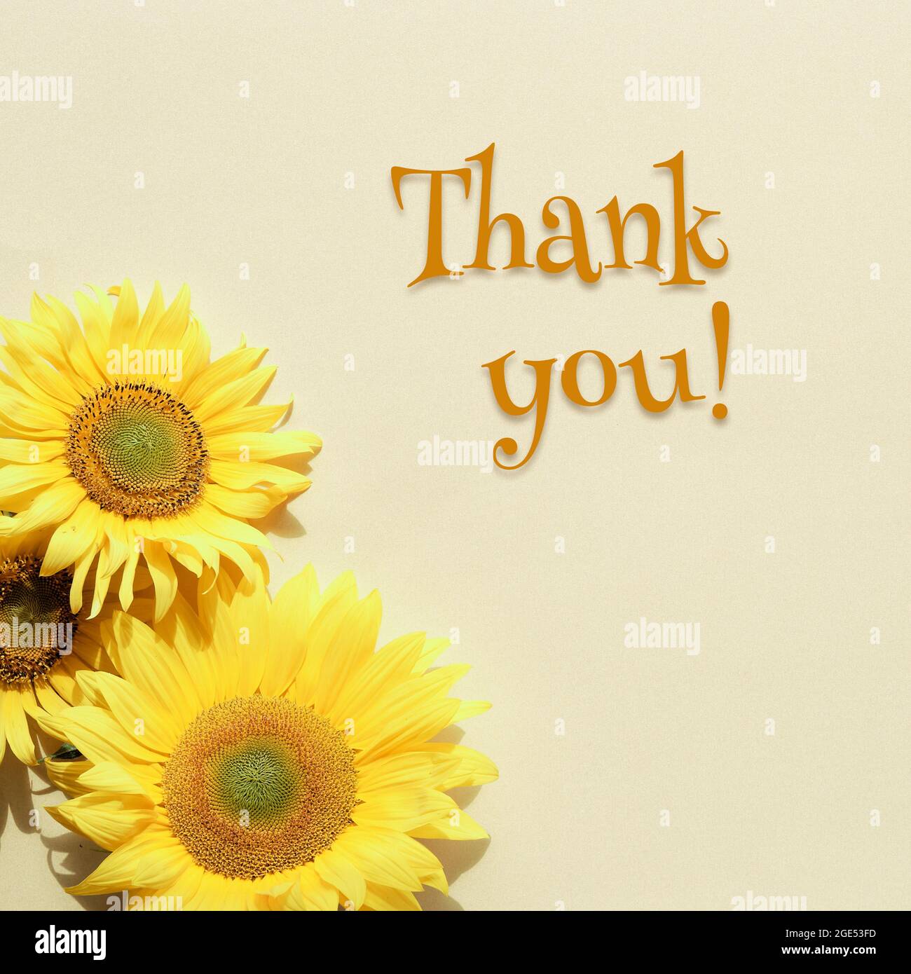 Thank you, text with sunflowers on square flat lay. Beige, yellow